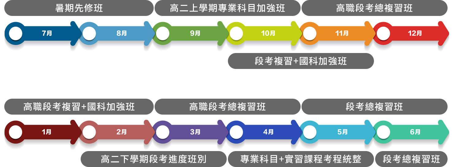 高職的專業科目課程,高一是專業的基礎、高二就為重點的專業科目課程。故若想要學好高職專業科目,無論你是北、中、南、公立、還是私立學校的同學。要想要在統一入學測驗考出好成績。那就必須得要在高職一年級、高職二年級就打穩基礎。才能戰勝統測